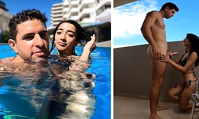 латиноамериканка делает небрежный минет на улице у бассейна